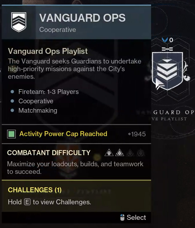 | Standard | 1945 | Focus on growing your Power level to the Powerful and Pinnacle caps. | Vanguard Ops, Seasonal activities, Exotic missions, raids, and dungeons |